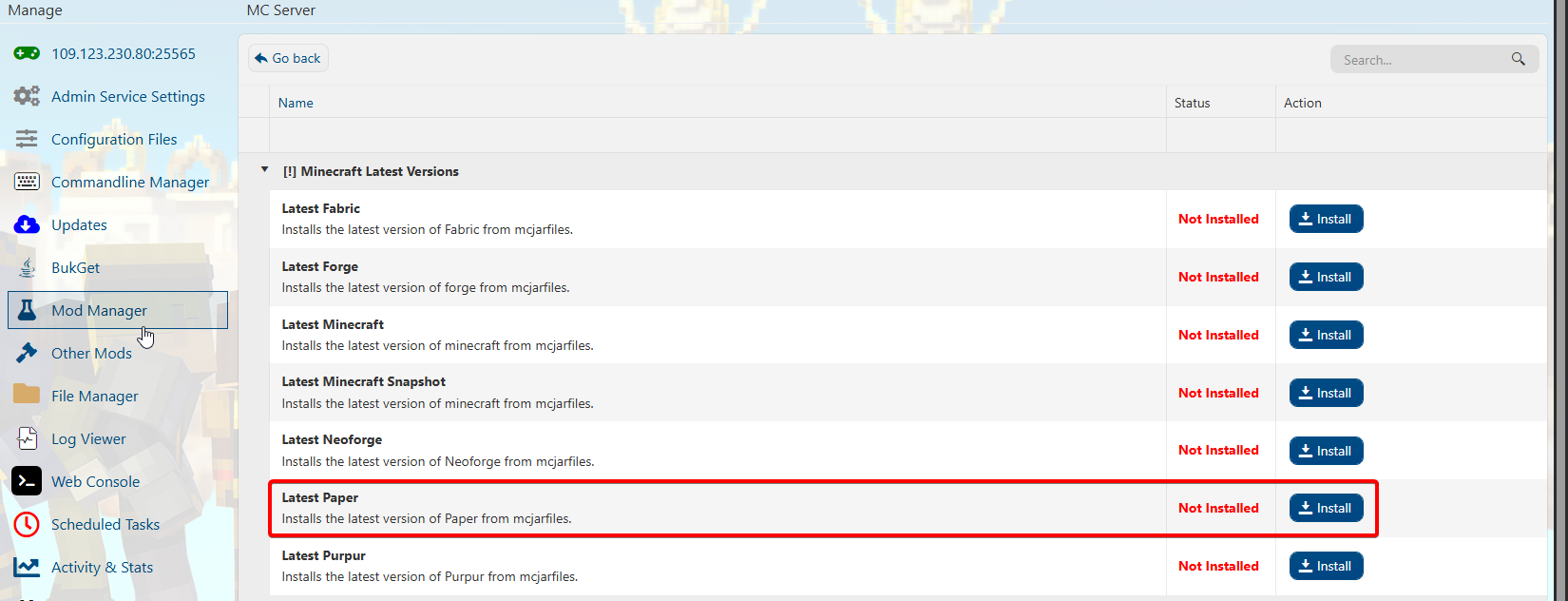 2. Open the Mod Manager tab and find the MC Latest Versions Section.